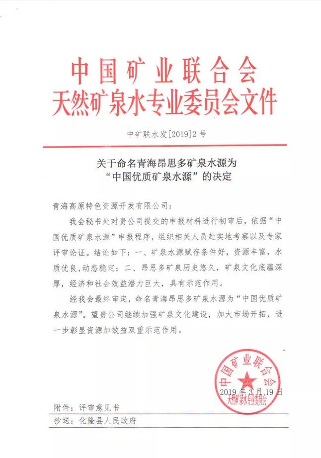 国矿业联合会天然矿泉水专业委员会的“优质矿泉水源地”的认证